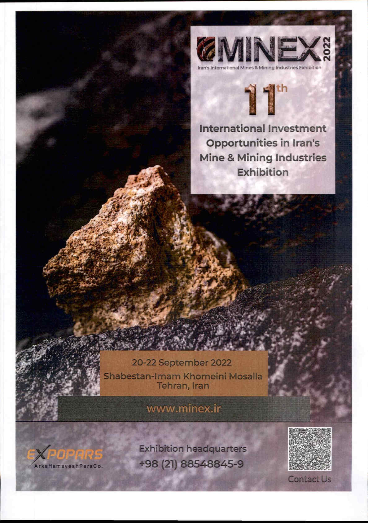 The 11th International Investment Opportunities in Iran's Mine and Mining Industries Exhibition is slated for 20–22 September 2022 in Tehran, Iran.
